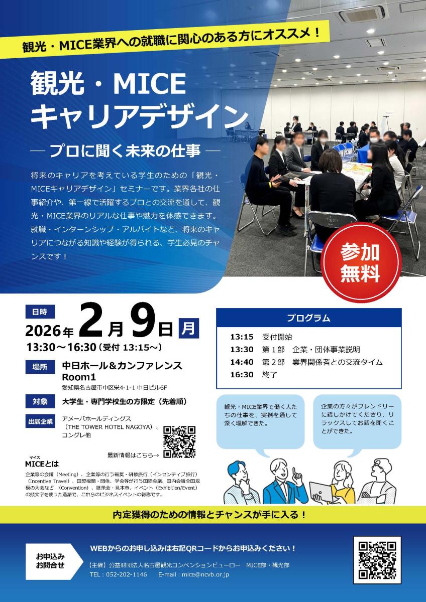 当日は、関連事業者からの事業説明とその事業者との交流タイムも設け、採用、インターンシップやアルバイトなどの情報も得られるような機会を得ることのできる説明会を開催いたします。(本日時点で、アメーバホールディングス(THE TOWER HOTEL NAGOYA)様、コングレ様の出展が予定されております)観光・MICE業界に興味のある方はもちろん、キャリアの選択肢を広げたい方は、ぜひご参加ください。
