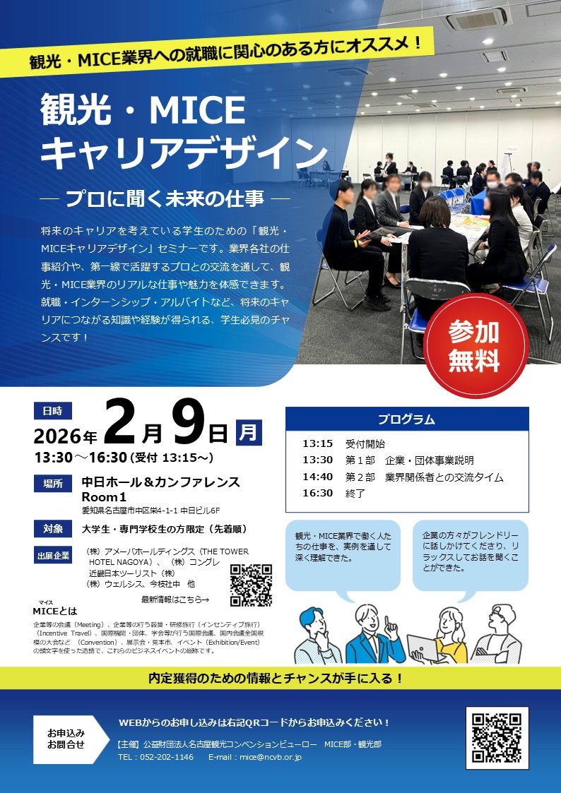 当日は、関連事業者からの事業説明とその事業者との交流タイムも設け、採用、インターンシップやアルバイトなどの情報を得る機会もあるセミナーを開催いたします。((株)アメーバホールディングス(THE TOWER HOTEL NAGOYA)、(株)コングレ、近畿日本ツーリスト(株)、(株)ウェルシス、尾張万歳 今枝社中、ジャパン・ホスピタリティ・サービス(株)(コートヤード・バイ・マリオット名古屋 フォーポイントバイシェラトン名古屋中部、(株)インターグループ)様 の出展が予定されております)観光・MICE業界に興味のある方はもちろん、キャリアの選択肢を広げたい方は、ぜひご参加ください。