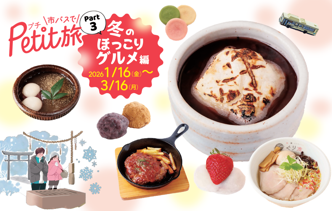 | 備考 | ・店舗の都合により、営業時間・休業日等が変更となる場合があります。事前にご確認の上おでかけください。 ・割引クーポン及び店舗独自特典は、開催期間中以外はご利用できません。 ・店舗独自特典は開催期間中、店舗ご利用のお客様に限り「プチ旅専用乗車券一枚につき1名様・各店舗一日一回」ご利用当日の日付入り乗車券を提示することで受けられます。 ・プチ旅専用乗車券の有効期間は、2026年3月16日(月)までです。有効期間外はご乗車できません。 ・払戻しは、未使用の乗車券と割引クーポン付き台紙がセットの場合に限り、2026年3月16日まで取扱います。 |