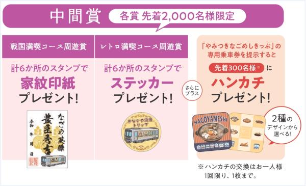 中間賞交換の際に、一日乗車券にお食事チケットがついたお得なきっぷ「やみつきなごめしきっぷ」の専用乗車券を提示すると、先着300名様にもれなくハンカチプレゼント!