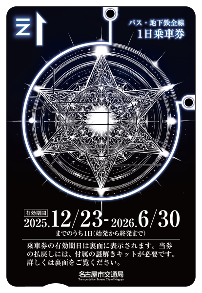| 備考 | ※謎解きの進行にはLINEアプリを使用します。スマートフォン、タブレットなど、インターネットに接続が可能な端末をご準備ください(通信費はお客さまのご負担となります)。 ※中学生以上の方を対象とした難易度設定となっています。(小学生の方も保護者同伴でお楽しみいただけます。) ※販売場所の詳細は特設サイトでご確認ください。 ※交通局サービスセンター及び名古屋観光案内所でのお支払いは現金のみの取り扱いとなります。 ※2026年3月14日~4月12日は、交通局サービスセンターでの販売は行いません。 ※地下鉄駅駅長室やバス営業所での販売はありません。 ※払戻しは、未使用の専用一日乗車券と謎解きキット(未開封)がセットの場合に限り、交通局サービスセンターでのみ取り扱います(手数料100円)。 ※払戻しは、イベント終了日の2026年6月30日までの取り扱いとなり、翌日以降は対応が出来かねますので十分にご注意ください。 ※販売場所までの交通費はお客様負担となります。 |