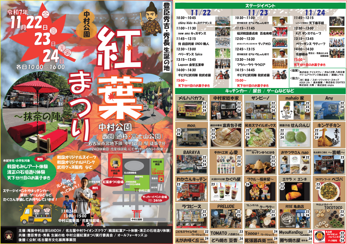 豊臣秀吉・秀長、加藤清正の生誕地・中村公園を舞台に、紅葉の季節に開催される市民交流イベントです。抹茶や書道などの和文化体験、黄金の茶室でのフォトスポット、戦国もみじアートや清正の石垣造り体験、サッカー教室などの子ども向け企画を通じ、世代を超えて楽しめる内容とし、地域経済の活性化や観光振興、名古屋の魅力発信を目的として実施します。