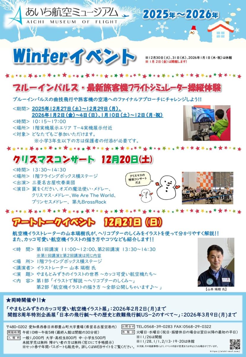 あいち航空ミュージアムでは、現役ドクターヘリCSで航空機のイラストレーターとしても活動する山本瑞樹氏によるイラスト展やアートトークイベントのほか、三菱名古屋吹奏楽団によるコンサートやフライトシミュレーター体験など、 幅広い世代の皆様にお楽しみいただけるイベントを開催します。