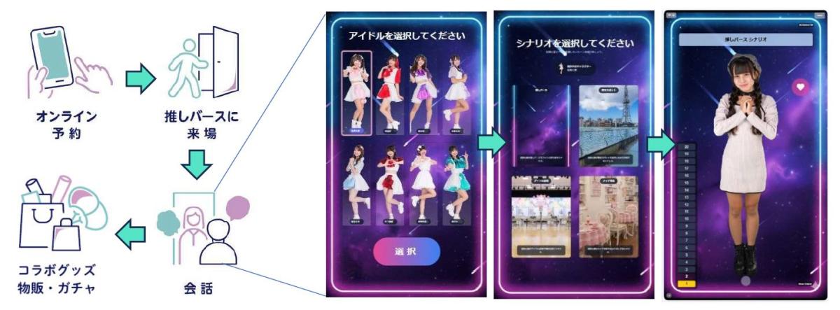 「推しバース」では、最先端技術を活用することでさまざまな姿の等身大AIアバターと多様なシーンで二人きりの没入感あふれる会話を楽しむことができます。また、「推しバース」のAIアバターは、ふたりの会話の記憶を蓄積し、これまでの会話内容や対話時の感情に応じて会話内容が変化します。何度も会話を重ねることで関係性や会話内容が変わっていく、新たな対話型エンターテイメントです。