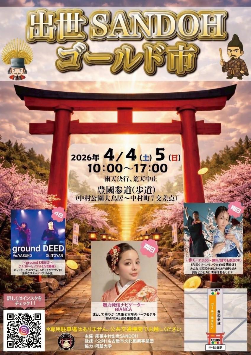 2026年4月、歴史ある豊國参道にて「出世SANDOHゴールド市」を開催します!地元の新鮮な野菜や手作り雑貨、美味しいグルメがずらりと並び、参道が活気あふれる“産道”に変わります。ご家族連れはもちろん、観光や散策に訪れた方も楽しめる内容となっております。秀吉公ゆかりの地で、地域の魅力を再発見しませんか?皆さまのご来場を心よりお待ちしております!