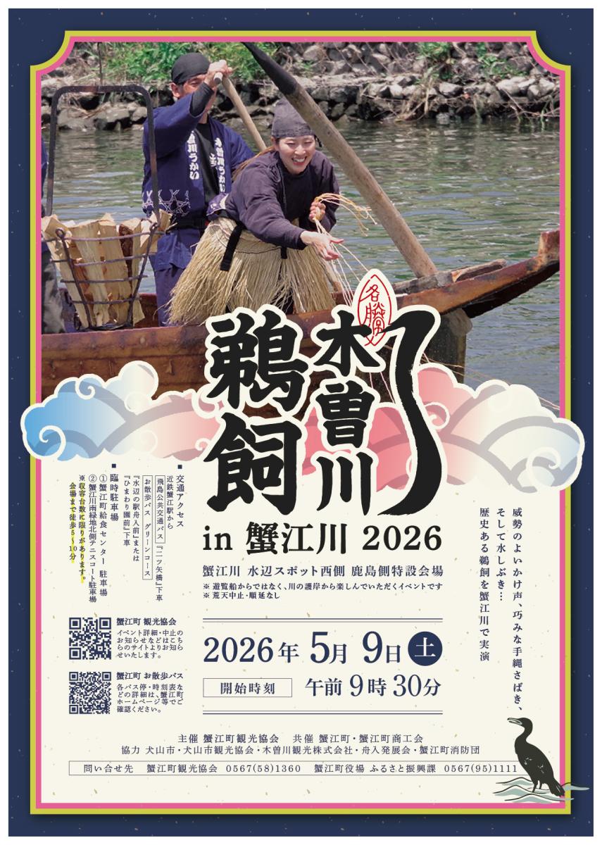 今年も犬山市協力により、1,300年の歴史を誇る木曽川鵜飼が蟹江川で開催されます。