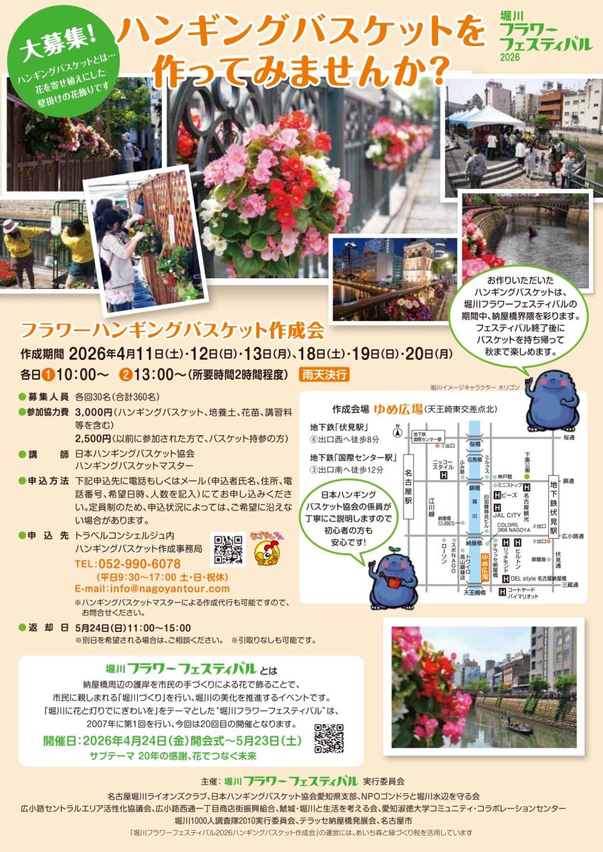 毎年春に名古屋市を流れる堀川の納屋橋周辺を会場として開催されるイベント「堀川フラワーフェスティバル」のプレイベントとして、イベント期間中に堀川納屋橋周辺の沿川を彩るハンギングバスケットの作成会を開催します。