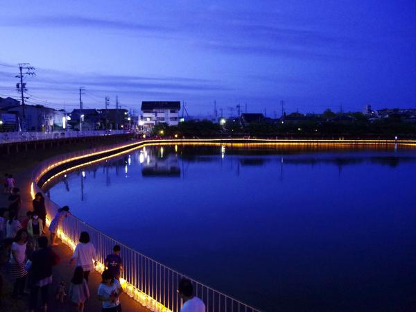 日没後戦死者を弔い、3,500本の灯ろうを大池の周りに点灯します。