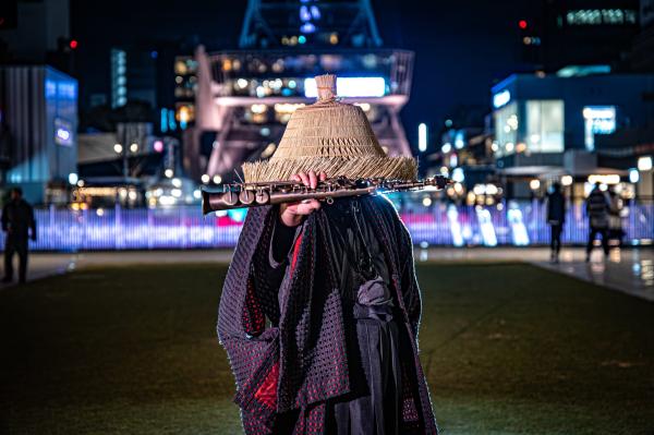 名古屋を中心に活動する、編み笠を被った侍姿のストリートサックスプレイヤー。