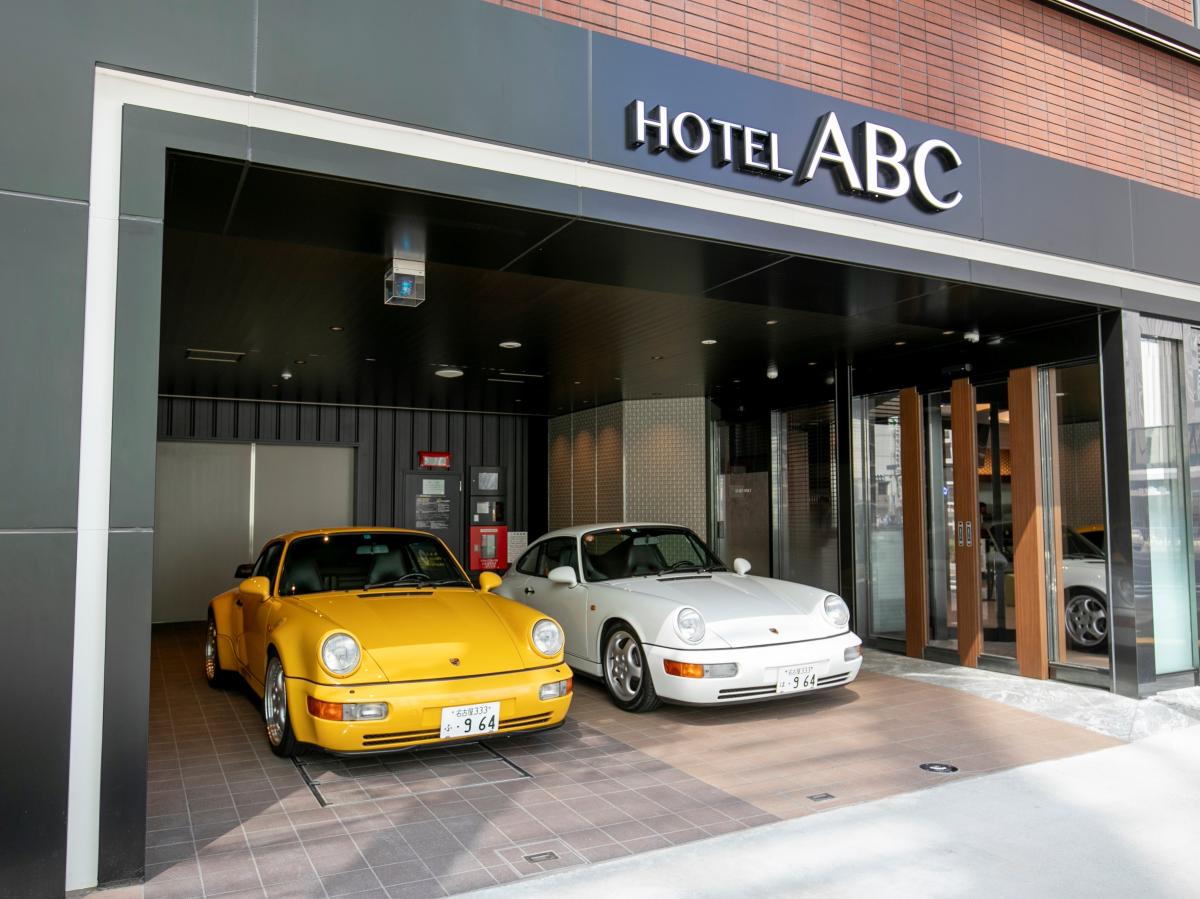 名古屋駅に近接する14階建てのホテルABCは自動式立体駐車場の完備や、快適さへのこだわりを追求した、上質で心地よい全6タイプのゲストルーム完備、全室に、「シモンズ」社のベッドを採用。さらに全室に間仕切りスライドドアを設置することで、最高水準の遮音性を実現しました。エレベーターも専用カードキーでお部屋以外のフロアには停止しないようになっており、セキュリティーも万全1階ロビーにはポルシェを展示しています。