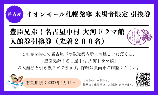 ※引換券本体は「豊臣兄弟!名古屋中村 大河ドラマ館」の入館券ではございませんので、必ず上記の2か所どちらかで入館券とお引き換えください。