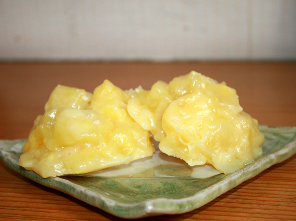 お店で一番人気の鬼まんじゅう。色は黄色でおいもも大きく、自然な甘さが魅力です。