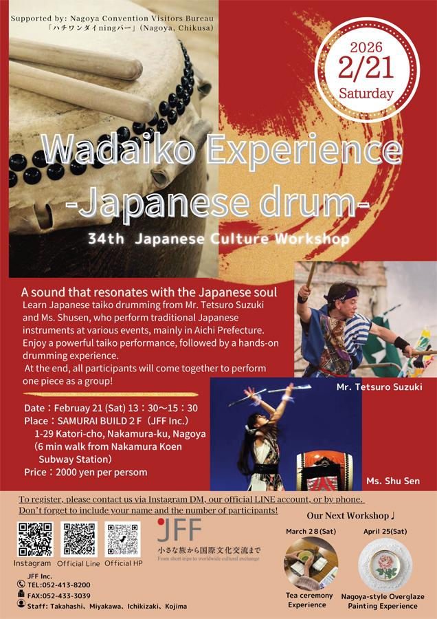 | Instructors | This workshop will be led by professional taiko performers active mainly in Aichi Prefecture: •Mr. Tetsuro Suzuki (TSUWAMONO Sai), who performs traditional Japanese instruments at various events •Ms. Shusen, a female taiko drummer of the Ryuo-style Taiko School They will carefully guide you through the joy, power, and beauty of taiko drumming. |